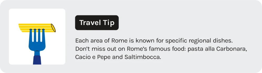 The area isn’t touristy, so you’ll see Italian parents shopping at the local market while their kids play in the piazza. The area is the origin spot for many of Rome’s famous dishes, and you can’t go wrong with any restaurant you pass.