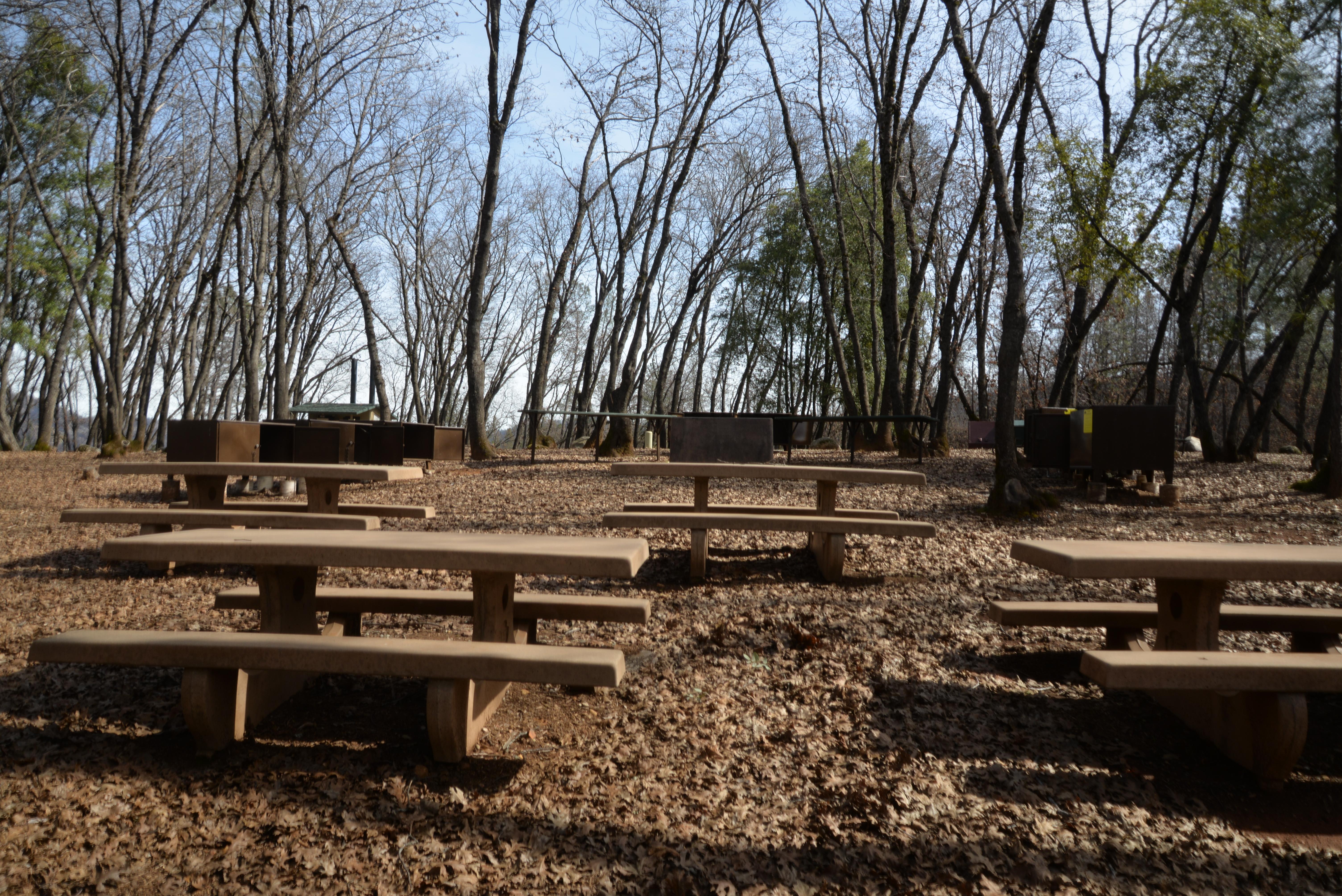 Dry Creek Group Campground includes two large campsites. Each site is primitive and may be reserved for groups of up to 50 people (20 people minimum). The campsites are located within oak woodland on a peninsula surrounded on three sides by Whiskeytown Lake. The primitive campground is located near Brandy Creek Marina.