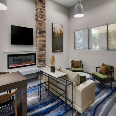 A fireplace adds warmth to the hotel's lobby area. Several guest rooms include a wet bar. Interior Corridors, 3 Stories, Smoke Free, 75 Units